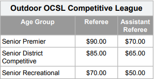 Below is a table outlining the 2026 game fees for match officials. This is the amount that the match official(s) are paid per game. It does not include the additional $12.00-15.00 per game that clubs are invoiced by the district to assign the games and E2E processing fee.